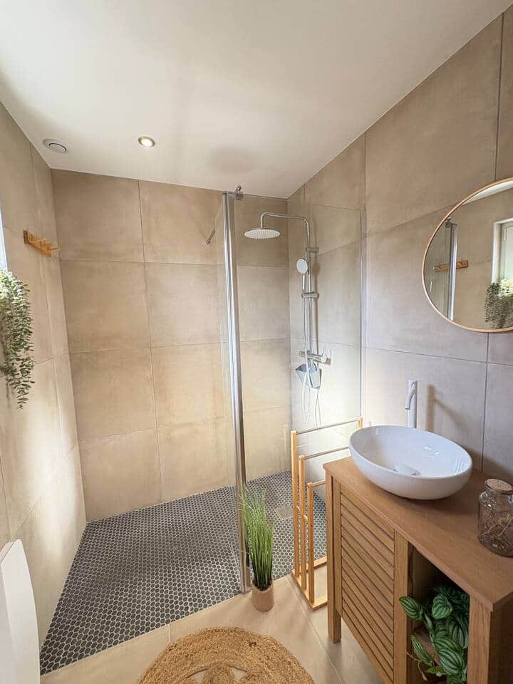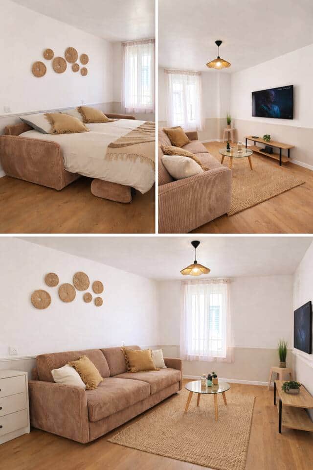 Dans la maison, vous trouverez une cuisine entièrement équipée (3 bouteilles de champagne au frais, pour votre confort : 25€/ bouteille), un espace pour manger conviviale, une chambre élégante avec un grand lit double (kingsize 160x200), un coin Tv (connecté, Netflix…) avec un canapé lit (véritable matelas) qui se transforme en un lit double (160x200), une salle de douche (italienne), et un WC indépendant.